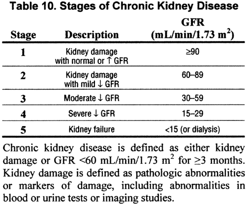 The guidelines also staged kidney disease into 5 stages according to the level of kidney function. Stage 1 being GFR of more or equal 90. Stage 5 is a GFR of less than 15.