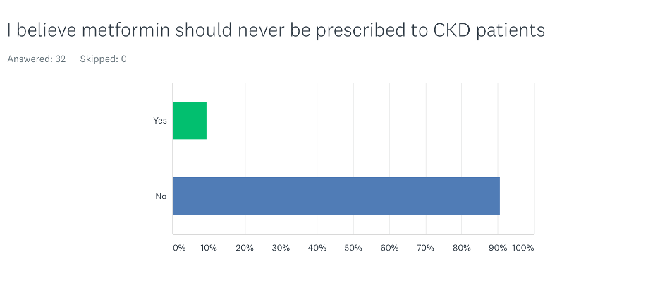 In the survey, 28% of participants believed that metformin causes acute kidney injury. The majority of those were primary care physicians. Only 7% of nephrologists believed that metformin causes acute kidney injury.